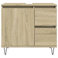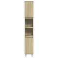 This stylish bathroom furniture set is an excellent addition to your bathroom, giving it a tidy and striking appearance! Durable material: The engineered wood is of exceptional quality with smooth surface and also features strength, stability, and resistance to moisture.Ample storage space: This bathroom furniture offers ample storage space to easily accommodate your essential toiletries and bath items, such as soaps, shampoo, toothpaste, etc.Iron feet: The iron feet add an industrial style to your interior while ensuring the stability of the bathroom storage cabinet.Practical door: Keep your space clutter-free by hiding small essentials behind the door of this bathroom cupboard. And the door can be assembled on the left or right as per your preference. Good to know:Screws and plugs for inside the wall are not included. We advise you to find and use screws and plugs suitable specifically for your walls. If you're not sure, you can consult with a professional. Please read and follow each step of the instructions. Warning:To prevent it from tipping over, this product must be used with the provided wall attachment device.