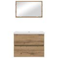 This trendy bathroom furniture set combines sleek design with smart functionality, making it a great fit for modern homes. With its clean lines and minimal fuss, it gives any bathroom a lift while being super useful with its wall-mounted setup. Designed to make the most of your space, it’s perfect for anyone wanting to maximise their bathroom experience, whether you’re on your own or with the family. Made from engineered wood and metal, it blends style with everyday practicality, offering good looks and convenience. Engineered Wood Frame The main material, engineered wood, keeps the furniture sturdy and reliable. It's smooth, durable and can handle daily use without falling apart. Plus, the natural finish adds to the modern vibe of the bathroom set, making it look nice and coordinated. Metal Accents The metal bits used in the design add a nice touch of style and strength. They’re not just for show—they also give extra stability and resilience, pairing functionality with a contemporary look. Wall-Mounted Mirror With a flat mirror surface, it gives you a clear view, ideal for all your grooming needs. Being wall-mounted keeps it neat and tidy, as it doesn’t take up too much space. Sink and Cabinet The set features a roomy sink cabinet, offering loads of storage space to keep your bathroom uncluttered. With compartments and shelves, it handles everything from toiletries to towels easily, giving you a tidy setup. Care Instructions To keep the set looking good, just clean it with a damp cloth and steer clear of harsh chemicals. Regular upkeep will help it last longer and stay looking sharp, keeping the furniture's look and function intact for years.