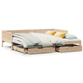 This 2-in-1 daybed with trundle, serving as both a sofa and bed, makes a practical and eye-catching addition to your living room or bedroom. Versatile daybed: The sofa bed functions as a sofa during the day and easily converts into a double bed at night by pulling out the trundle, providing a convenient solution for hosting guests and maximising space.Stable and long-lasting frame: Solid pinewood is known for its strength and durability. Its straight grains and distinctive knots contribute to its rustic charm.Slats for optimal support: The couch bed is complete with slats to offer essential support and breathability to your mattress.Ample storage space: This guest bed has two drawers that provide ample space for storing your clothes, socks, toys, cushions, etc. Good to know:Mattresses are not included with this bed. We do offer a various selection of mattresses. You can check our shop for matching mattresses.