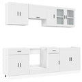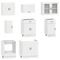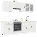 This 8-piece kitchen cabinet set, with its elegant design, optimises your kitchen space and provides ample storage space for your personal belongings! Stable and durable material: Engineered wood is a durable and stable material with a smooth surface that is resistant to moisture, warping, and splitting, making it a reliable choice for a variety of projects.Ample storage space: The kitchen cabinet set has many compartments, and offers sufficient space to store bowls, plates, pots, and other kitchen appliances.Adjustable feet: The bottom cabinets feature adjustable feet that can be adjusted in height to suit your kitchen layout.Easy to maintain: Thanks to its smooth surface, these kitchen cabinets are easy to clean with a damp cloth and require less maintenance. Warning:To prevent it from tipping over, this product must be used with the provided wall attachment device. Good to know:Screw(s) and plug(s) for inside the wall are not included. Seek and use screw(s) and plug(s) suitable for your walls. If you are uncertain, seek professional advice. Read and follow each step of the instruction carefully.The worktop, sink and faucet are not included in the delivery.