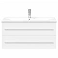 This stylish bathroom sink cabinet with a built-in basin, featuring spacious storage space, is an excellent addition to your bathroom, giving it a tidy and striking appearance! Sturdy material: The under sink cabinet is made of engineered wood, that is of exceptional quality with smooth surface and also features strength, stability and resistance to moisture.Ample storage: The bathroom sink unit features 1 drawer, offering ample storage space to store items in your bathroom.Wall-mounted function: The bathroom cabinet can be wall-mounted to add extra storage space. That way, you can maximise your floor space and keep the area clean.Elegant basin: The bathroom basin is made of smooth ceramic that is long-lasting service and easy to clean. The glazed surface brings itself a modern yet elegant design.Practical overflow: The wash basin is equipped with an overflow-preventing option to allow the water out when it gets too full. Good to know:Screw(s) and plug(s) for inside the wall are not included. Seek and use screw(s) and plug(s) suitable for your walls. If you are uncertain, seek professional advice. Read and follow each step of the instruction carefully.The faucet and push drainer with overflow function are included.The tap is a hot and cold tap, and if you have a need for hot water, a water heater must be connected.