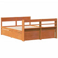 Get a better restful night's sleep from this bed frame! It makes a welcoming addition to any bedroom. Stable and long-lasting frame: Solid pinewood is known for its strength and durability. Its straight grains and distinctive knots contribute to its rustic charm.Slatted base for optimal support: The bed frame is equipped with a slatted base for support and breathability for your mattress.Make full use of space: This bed frame features four drawers underneath, providing storage for items like extra bedding, seasonal clothing, and toys.Ample storage space: This sleek headboard of the bed features three convenient shelves, offering ample storage space to keep all your nighttime essentials within easy reach.Freestanding headboard: The freestanding headboard offers a hassle-free solution for effortless placement and repositioning without the need for wall installation. Good to know:A mattress is not included with this bed. We do offer a various selection of mattresses. You can check our shop for a matching mattress.