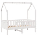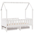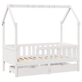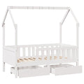 Your child will adore this fantastic wooden Kids' house bed frame, whether they're dreaming up their next adventure or drifting off to sleep. Stable and long-lasting frame: Solid pinewood is known for its strength and durability. Its straight grains and distinctive knots contribute to its rustic charm.Playful house design: This playful house-inspired bed frame transforms sleeping time into a whimsical adventure for kids. It provides a cosy spot for bedtime and a playful area for imaginative play.Rails for enhanced safety: This bed frame is equipped with side rails to prevent your child from falling out of bed while sleeping.Open roof structure for DIY: The open roof structure provides endless design possibilities, allowing you to easily hang decorations or attach a play tent to create a truly magical and personalized space.Spacious under-bed storage: This bed frame is designed with ample space underneath for storage boxes, baskets, drawers, and more.Effortless manoeuvrability: This under-bed storage drawer features four wheels, providing smooth and effortless manoeuvrability for sliding in and out from beneath your bed. Good to know:A mattress is not included with this bed. We do offer a various selection of mattresses. You can check our shop for a matching mattress.
