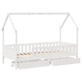 Your child will adore this fantastic wooden Kids' house bed frame, whether they're dreaming up their next adventure or drifting off to sleep. Stable and long-lasting frame: Solid pinewood is known for its strength and durability. Its straight grains and distinctive knots contribute to its rustic charm.Playful house design: This playful house-inspired bed frame transforms sleeping time into a whimsical adventure for kids. It provides a cosy spot for bedtime and a playful area for imaginative play.Rails for enhanced safety: This bed frame is equipped with side rails to prevent your child from falling out of bed while sleeping.Open roof structure for DIY: The open roof structure provides endless design possibilities, allowing you to easily hang decorations or attach a play tent to create a truly magical and personalized space.Spacious under-bed storage: This bed frame is designed with ample space underneath for storage boxes, baskets, drawers, and more.Effortless manoeuvrability: This under-bed storage drawer features four wheels, providing smooth and effortless manoeuvrability for sliding in and out from beneath your bed. Good to know:A mattress is not included with this bed. We do offer a various selection of mattresses. You can check our shop for a matching mattress.
