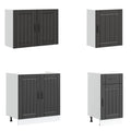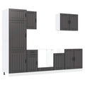 This 7-piece kitchen cabinet set, with its elegant design, optimises your kitchen space and provides ample storage space for your personal belongings! Stable and durable material: Engineered wood is a durable and stable material with a smooth surface that is resistant to moisture, warping, and splitting, making it a reliable choice for a variety of projects.Ample storage space: The kitchen cabinet set has many compartments, and offers sufficient space to store bowls, plates, pots, and other kitchen appliances.Adjustable feet: The bottom cabinets feature adjustable feet that can be adjusted in height to suit your kitchen layout.Easy to maintain: Thanks to its smooth surface, these kitchen cabinets are easy to clean with a damp cloth and require less maintenance. Warning:This product must be secured by installing a worktop. Good to know:Screw(s) and plug(s) for inside the wall are not included. Seek and use screw(s) and plug(s) suitable for your walls. If you are uncertain, seek professional advice. Read and follow each step of the instruction carefully.The worktop, sink and faucet are not included in the delivery.