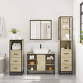 This stylish bathroom furniture set is an excellent addition to your bathroom, giving it a tidy and striking appearance! Stable and durable material: Engineered wood is a durable and stable material with a smooth surface that is resistant to moisture, warping, and splitting, making it a reliable choice for a variety of projects.Stable and long-lasting frame: The metal frame of the cabinet enhances your interior with an industrial style and provides exceptional durability, stability and resistance to corrosion.Ample storage space: This bathroom furniture offers ample storage space to keep your essentials well organised and within reach.Practical cabinet top: The top of the sink cabinet has a hole, so it is ideal for placing the sink.Wall-mounted function: The washroom mirror cabinet can be wall-mounted to save floor space, which makes it especially suitable for rooms with limited space. Warning:To prevent it from tipping over, this product must be used with the provided wall attachment device. Good to know:Screws and plugs for inside the wall are not included. We advise to find and use screws and plugs suitable specifically for your walls. If you're not sure, you can consult with a professional. Please read and follow each step of the instructions.
