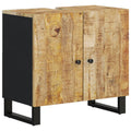 This handy bathroom furniture set, featuring spacious storage space, is an excellent addition to your bathroom, giving it a tidy and striking appearance! Solid mango wood: The cabinet is made of solid mango wood combined with engineered wood. Solid mango wood is a strong, tropical hardwood that makes sturdy furniture. Its beautiful wood grains make every piece of furniture slightly different from the next.Ample storage space: The bathroom storage cabinet provides various storage options and spacious space for you to store items in your bathroom.Wall-mounted function: The bathroom wall cabinet and vanity mirror can be wall-mounted easily. That way, you can maximise your floor space and keep the area clean.Stable feet: The iron feet of the bathroom cabinet ensure sturdiness and stability.Practical design: The top of the bathroom sink cabinet is ideal for placing the sink.Clear image: The glass mirror face provides a clear image. So, you can enjoy a beautiful and natural reflection when standing in front of it. Warning:To prevent it being overturned, this product must be used with the provided wall attachment device.Good to know:The sink is not included in the delivery.Screws and plugs for inside the wall are not included. We advise to find and use screws and plugs suitable specifically for your walls. If you're not sure, you can consult with a professional. Please read and follow each step of the instructions.Each item is unique with variations in colours and grains. The delivery is random, ensuring the exclusivity and individuality of your product.