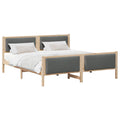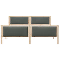 This Modern Bed Frame is an exquisite addition to any bedroom, effortlessly merging style and functionality. Its rectangular shape embodies contemporary elegance, making it an ideal choice for anyone seeking a sleek look and substantial presence in the bedroom. Whether for winter's coziness or summer's coolness, this bed frame is adaptable, creating a statement piece in any seasonal setup. Its overall appearance is augmented by the clean lines and dynamic styling, ready to set the tone of a vibrant bedroom setting. Solid Pine Wood Construction: The sturdy bed frame is crafted from high-quality solid pine wood, offering lasting strength and stability for peace of mind. This durable material ensures the frame withstands daily use and supports a comfortable night's rest. Platform Slatted Base: Equipped with a platform slatted frame, it provides uniform mattress support, enhancing relaxation and comfort. The solid base design minimizes movement, promoting a restful sleep experience. Polyester Upholstered Headboard: Featuring a chic polyester headboard, this bed frame adds a touch of elegance while providing a cushioned surface for leaning and reading. Its soft texture contrasts beautifully with the robust frame. Ample Under-Bed Room: Offers generous space beneath the bed, perfect for storing essentials, optimizing bedroom organization. This feature enhances room appearance by reducing clutter. Contemporary Design: Embodies current design with its sharp look, tailored for modern homes. Fits seamlessly into various interiors, enhancing the room's aesthetic while allowing versatility.