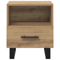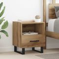 This stylish and handy bedside cabinet is made to match a rustic bedroom vibe. Made from engineered wood and sporting sleek black metal square legs, it’s got the looks and the function you need for your nighttime essentials. It's perfect for a lamp or alarm clock, plus it has plenty of room for your personal bits, making it a must-have for any cozy bedroom. Engineered Wood Finish: Made from engineered wood, it’s tough and built to last in your bedroom. The smooth finish gives it a comfy look and it’s resistant to stains, so it’s easy to keep clean. Ample Storage: It’s got two roomy shelves and a drawer for easy organization. The shelves let you grab what you need quickly, while the drawer keeps your stuff out of sight. Modern Handle Design: With matte finish bar handles, getting into the drawer is a breeze. These stylish handles add to the modern look and work smoothly. Solid Metal Frame: The metal frame gives it solid support. The square legs keep it looking simple and fresh, perfect for modern spaces with clean lines. Practical Care Instructions: To keep it lasting, just wipe it down with a dry cloth to avoid moisture. This simple maintenance keeps it looking top-notch all year round, ideal for busy lives.