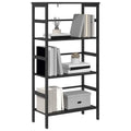 This Industrial Bookshelf stands as a striking exemplar of contemporary industrial aesthetics, characterized by its sleek, bold lines and raw materials, making it an ideal addition to home offices, studies, or living rooms. With its robust structure crafted from engineered wood and steel, this freestanding unit seamlessly combines functionality with modern flair. The richly layered shelves offer ample room for storing books, decor, and other essentials, embodying both style and utility as it complements a variety of urban and rustic settings. Industrial Style Design The bookshelf elevates any environment with its industrial-inspired design, reflecting the rugged charm of industrial spaces with clean lines and a bold, black finish. This aesthetic appeal makes it a versatile centerpiece, fitting seamlessly into home offices, living rooms, or studies, providing a modern edge to the decor. Ample Storage Capacity Featuring numerous rectangular board shelves made from engineered wood, this bookshelf ensures each shelf is ready to hold a substantial amount of books, decor items, or office essentials. Its easy-access shelves invite organization and display, seamlessly integrating utility and style for a tidy, stylish space. Robust Construction Built with a steel frame and square legs, the bookshelf guarantees steadfast support, ideal for heavy loading. The engineered wood surface adds durability, making it abrasion-resistant and low-maintenance, ensuring the bookshelf's longevity through daily use, while maintaining its aesthetic appeal. Adjustable Stability Levelers on the bookshelf’s feet provide easy adjustments to stabilize it on uneven surfaces. The inclusion of levelers not only protects floor finishes but also ensures that the bookshelf maintains its sturdiness and balance even on slightly sloped floors. Simple Maintenance Instructions Designed with convenience in mind, the bookshelf surfaces require minimal maintenance. Wipe with a dry cloth to keep it dust-free and maintain its pristine appearance. Avoid harsh chemicals and abrasives, preserving its finish against wear, tear, and unnecessary cleaning-induced deterioration.