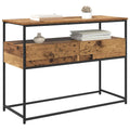 This industrial console table is a stylish blend of function and flair, perfectly fitted for a contemporary living room. Its rectangular shape and narrow profile make it ideal for placement against a wall, offering an eye-catching display or storage space. The table exudes a distinctive urban loft vibe, featuring a robust iron frame and engineered wood surfaces that beautifully encapsulate the raw aesthetics of industrial design. Whether used to showcase decorative items or to enhance storage, this console table integrates seamlessly with a trendy, metropolitan lifestyle. Robust Iron Frame With its iron construction, the frame of this console table guarantees stability and longevity, preventing any wobbling or swaying. This ensures it stands sturdy in any high-traffic living area, supporting a variety of items on its surface and shelves. Ample Shelving and Drawer Space Equipped with both board shelves and drawers made from engineered wood, this console offers generous storage options. This is perfect for organizing living room essentials, decorations, or books and keeping areas tidy. Narrow Profile and Versatile Usage The slim, rectangular shape allows for effortless integration into tight spaces, such as narrow hallways or compact living rooms. It serves as an optimal solution for maximizing space without overwhelming the area. Adjustable Leveling Feet Included levelers aid in stabilizing the console table on uneven flooring, maintaining balance and safeguarding all stored or displayed items. Simple Maintenance The industrial console table is easy to maintain, requiring only a dry cloth for dusting. Harsh chemicals or abrasives should be avoided to preserve its finish and longevity.