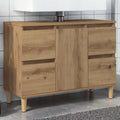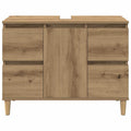 This sink cabinet is meant to be a great addition to your bathroom, giving it a tidy and striking appearance! Long-lasting material: The engineered wood is of exceptional quality with a smooth surface and also features strength, stability, and resistance to moisture.Ample storage space: The bathroom sink cabinet features 4 drawers and 1 compartment with a door, offering various storage options and extra space to store items in your bathroom. The top of the bathroom cabinet is ideal for placing the sink.Sturdy structure: The solid eucalyptus wood feet give the under sink cabinet a natural and pleasant look while ensuring stability.Easy to maintain: Thanks to its smooth surface, the cabinet is easy to clean with a damp cloth and requires less maintenance. Warning:To prevent it from tipping over, this product must be used with the provided wall attachment device. Good to know:The sink is not included.