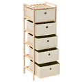 This solid wooden storage rack with 5 separate fabric baskets will provide enough space to store your everyday objects. The storage unit is lightweight and can be easily placed anywhere in your home. The storage drawers are made of a light coloured fabric to give an elegant touch to your interior. The storage rack is easy to assemble. Delivery includes 2 storage racks.
