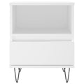 This trendy bedside cabinet, featuring a sleek and classic design, is meant to upgrade your interior to the next level. Durable material: The engineered wood is of exceptional quality with smooth surface and also features strength, stability and resistance to moisture. Made of engineered wood, the bedside table is easy to clean with a damp cloth.Ample storage space: The bed side table has a drawer and a compartment, providing ample space to keep your magazines, books, remote controls and other small items well organised and within reach.Sturdy top: The sturdy top of the nightstand is ideal for displaying decorative objects, photo frames and potted plants.Metal legs: The metal legs add a modern and calm style to your interior while ensuring stability. Warning:To prevent it being overturned, this product must be used with the provided wall attachment device.