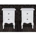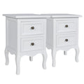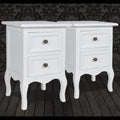 This set of two vintage style nightstands comes with full-sized drawers so that your bedside essentials will never be far from reach.Each piece has two drawers. Its clear lacquered real wood drawer sides make this nightstand even more elegant. It also features tapered cabinet legs and brushed nickel knobs. It is finished in durable white MDF. This listing is for a set of 2 nightstands packed in one carton. Note: Since this furniture is hand-crafted, made of wood and painted white, it may come with a small defect.