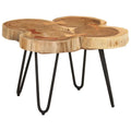 This wooden coffee table makes a timeless addition to your home decor. It can be also used as a side table. Solid acacia wood: The side table's top is made of solid acacia wood. Solid acacia wood is a beautiful natural material. Acacia wood is a tropical hardwood, which is dense, sturdy, and durable.Stable frame: The powder-coated iron frame ensures the sofa table's sturdiness and stability.Sturdy tabletop: The sturdy tabletop of the living room table is perfect for placing snacks, drinks, vases, fruit bowls, or other decorative items.Industrial style legs: The black powder-coated iron legs lend a feature of industrial style that gives impressive detail to the couch table.Rustic charm: The natural cracks and the shape of the trunk give the centre table a rustic charm, while the beautiful wood grain makes each table unique and slightly different from the next. Good to know:Colours and grains vary per furniture item, making each piece unique. The delivery is random, ensuring the exclusivity and individuality of your product.