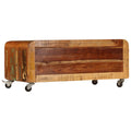 This classic-style wooden coffee table exudes a quaint charm. It will definitely make an attention-grabbing addition to your interior. The couch table is made of solid reclaimed wood which has been sourced from joists, floors and support beams from old buildings being demolished, and additionally it is capable to consist of different types of wood like pine, teak, beech, oak, cedar, mango wood, acacia, etc. This means the reclaimed wood retains the characteristics of these different types of wood. Reclaimed wood is already aged, weathered and dried, and consequently it doesn't shrink or bend. This side table is fully handmade and the refined wood grains make every piece of furniture distinctive and slightly different from each other. The metal hardware adds the cabinet's industrial style. This table features 2 cabinets with doors, providing commodious space for storing your multimedia appliances, books, as well as various other items. Equipped with 4 casters, the table is easy to move around. Important note: The colours vary from piece to piece, making each piece unique. The delivery is random, ensuring the exclusivity and individuality of your product.