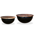 This set consists of 2 elegant wooden coffee tables with a unique, industrial design and will make a distinctive addition to your home. The unique, bowl-shaped steel base gives each table its industrial flair. Each table has a solid wooden tabletop, ideal for placing food and drinks, decorative items, books, etc., while the concealed storage compartment provides extra space to keep clutter at bay. The tabletop is made of solid reclaimed wood, which means that every table is unique and slightly different from the other, and has the characteristics of different woods, like teak, acacia, mango wood, etc. Reclaimed wood is solid, stable, durable and beautiful. The coffee table has undergone an elaborate process of polishing, painting and lacquering. Relax and enjoy entertaining your family and friends around this unique coffee table set! Delivery includes 2 coffee tables. Note: The coffee tables are already assembled; no assembly is required. Tabletop colours may vary from piece to piece, making each of our coffee tables unique. The delivery is random, ensuring the exclusivity and individuality of your product.