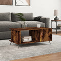 Add a touch of elegance to your living room with this stylish coffee table. Durable material: The engineered wood is of exceptional quality with smooth surface and also features strength, stability and resistance to moisture.Ample storage space: This side table has 2 compartments, offering ample storage space to keep your essentials well-organised and within reach.Sturdy tabletop: The sturdy tabletop of the sofa table is perfect for placing your drinks, food and other decorative items.Practical door: Keep your space clutter-free by hiding small essentials behind the door of the living room table.Iron legs: The iron legs add a calm style to your interior while ensuring stability.