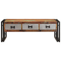 This solid wooden coffee table, with a spectacular vintage style, will make a decorative as well as practical addition to your decor. The table is made of solid reclaimed wood that has been sourced from joists, floors and support beams from old buildings being demolished, and can consist of different types of wood like pine, teak, beech, oak, cedar, mango wood, acacia, etc. This means the reclaimed wood retains the characteristics of these different types of wood. Reclaimed wood is already aged, weathered and dried, so it doesn't shrink or bend, and doesn’t require a finish. The beautiful wood grains make every piece of furniture unique and slightly different from the next. Signs of wear and visible grain structure are indicative of the wood's rich history and give the table a warm and authentic look. Every step of the process is carried out with the greatest care, be it polishing, painting or lacquering. The sturdy tabletop will be ideal for placing food, drinks, lamps or other decorative items. This coffee table has three drawers to provide you with extra storage space for keeping small items like keys, notepads, pens, remote controls, and other knick-knacks within reach. Its steel legs add to its sturdiness and stunning industrial style. Assembly is easy. Important note: Colours and grains may vary from piece to piece, making each of our coffee tables unique; the delivery is random.