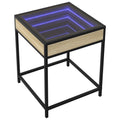 The unique coffee table with an LED infinity mirror is suitable for different places. Stable and durable material: Engineered wood is a durable and stable material with a smooth surface that is resistant to moisture, warping, and splitting, making it a reliable choice for a variety of projects.RGB LED Lights for a pleasant ambience: This table features LED lights that can be easily adjusted to create a personalised light show. You can customise the modes, colours, and brightness to enhance the ambience of your interior space.Sturdy tabletop: The sturdy tabletop of the living room table is perfect for placing your drinks, food and other decorative items.Multiple applications: This coffee table serves multiple purposes. It can function as a side table, end table, or couch table in your living room or bedroom, catering to your specific needs.Sturdy structure: The metal feet add a calm style to your interior while ensuring stability. Good to know:The product has a USB connector that requires a certified 5V USB power source (not included).