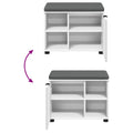 This stylish Modern Hall Bench is the ideal piece for enhancing your hallway or entryway space, offering both functionality and elegant simplicity. Boasting clean lines and a sleek look, it features a matte finish complemented by bold yet neutral colors, fitting perfectly into modern décor. This versatile bench combines seating with hidden storage, becoming an efficient and aesthetic solution for those who appreciate the balance of form and function in their interiors. Smooth Texture: The hall bench exhibits a refined smooth exterior, giving off an understated elegance while being easy to clean and maintain. Its tactile surface invites guests to experience both its aesthetic and practical design, while seamlessly blending into various room decors and styles. Component Materials: Comprising quality wood for both the frame and surface, this bench stands robust and resilient. The matte wood frame and surface are designed for longevity, offering both visual appeal and practicality. Thoughtful material selection assures a lasting presence in your home environment. Storage Functionality: The ample storage space makes this bench not only a seating option but also a utility piece. With board shelves contributing valuable organizational support, users can efficiently store footwear, hats, or bags out of sight, maintaining a neat and uncluttered entryway. Component Details: Hinged doors ease access to the storage compartment. The plastic knobs are durable yet stylish, ensuring usability over years of frequent handling. The bench cushions incorporate a convenient zipper closure system, allowing users to effortlessly remove and maintain them. Care &Maintenance: It is advised to steer clear of abrasive cleaners to uphold its surface integrity. Easy maintenance steps ensure that the bench remains a charming and useful feature in your home for the long term with minimal effort.