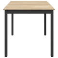 This rectangular dining table seamlessly combines modern aesthetics with functional design, making it a stunning centerpiece for any dining room or kitchen. Adorned with clean lines and a minimalist structure, it serves as an ideal choice for contemporary homes looking to enhance their interior with a touch of elegance. Its versatile form not only complements a variety of decor styles but also provides a practical surface for hosting dinners, gatherings, or everyday meals. Engineered Wood Surface The table features a sturdy engineered wood surface that provides excellent durability and resistance to everyday wear. Easy to clean, this material also offers a refined finish that enhances the overall appearance of your dining space. Its smooth texture makes it ideal for both social gatherings and quiet family dinners. Black Metal Frame The sleek black metal frame provides robust support to the table, ensuring stability during use. Its contemporary appearance blends seamlessly with modern decor, making it a perfect fit for both dining rooms and open living spaces. Square Metal Legs These square legs not only enhance the table's modern design but also offer a sturdy foundation. Designed for lasting performance, the legs ensure reliable support, maintaining the table's structural integrity over time. Ideal for those looking for a stable and secure dining experience. Simple Functionality Crafted for straightforward use, the table exemplifies practicality with its easy-to-clean surface. Just a simple wipe with a damp cloth keeps it looking pristine, making it an excellent choice for busy households or those who entertain frequently. Assembly Requirement Though assembly is required using a screwdriver, the process is straightforward and involves two people, allowing you to set up your dining area quickly and efficiently. This consideration makes it accessible and ideal for households looking to quickly enhance their dining space.