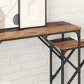 The console table is a refined blend of style and practicality, offering an elegant solution to home storage and display needs. With its sleek modern aesthetic characterized by simple lines and minimal ornamentation, this console table brings a sense of sophistication to any hallway or living area. Stylish Engineered Wood Surface Crafted from high-quality engineered wood, this surface showcases a beautiful finish that replicates the aesthetics of real wood while offering increased durability and resistance to wear over time. Its smooth tabletop is perfect for displaying cherished objects, books, or decorative items, elevating the look of your space. Robust Metal Frame The metal frame of the console table ensures lasting support and stability, making it a reliable choice for everyday use. Its black finish adds a touch of sophistication, seamlessly blending with modern and traditional decor. This solid construction guarantees the table remains resilient through years of use. Nested Design Featuring a space-efficient nesting design, these tables provide versatile options for arrangement and use. Whether stacked for storage or displayed separately, they offer unique styling possibilities tailored to your room's layout. This flexibility greatly enhances your ability to optimize space efficiently. Functional Storage Space With generous surface area, the console table is perfect for holding essential items like keys, mail, or decorative accents. Its smart design aids in reducing clutter, keeping personal items organized and within reach, adding both form and function to your space. Easy Assembly Needed Assembly is required and is best accomplished by two people using basic tools like a screwdriver and hammer. This hands-on process, while straightforward, ensures that your table is securely constructed for optimal use and longevity.