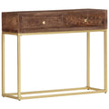 This vintage-style and practical wooden console table will make a timeless addition to your home decor. The side table, with hand carved parts in the front, is handmade of solid mango wood which is a dense and robust hardwood featuring beautiful brown or golden streaks and contours on its surface. Every step of the process is carried out with the greatest care, be it polishing or lacquering, and the craftsmanship adds to the spectacular retro style. The beautiful wood grains make every piece of furniture unique and slightly different from the next. The powder-coated steel frame adds to the entry table's industrial style. Besides, this hall cabinet features 2 drawers, providing ample space for keeping all kinds of smaller items organised and within reach. The item is easy to assemble. Important note: The colours vary from piece to piece, making each piece unique. The delivery is random, ensuring the exclusivity and individuality of your product.