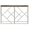 Combining functionality and beauty, this console table will be the focal point of your room. Solid reclaimed wood top: Solid reclaimed wood consists of reused timbers such as teak, mango wood, pinewood, and beech. These materials are recycled from old buildings such as factories, sheds, and boats. As every piece is handmade, colours will vary for each product. The top of the sofa table provides a secure and ample surface to place vases, potted plants, or other decorative items.Sturdy and stable frame: The stainless steel frame of the hall table ensures sturdiness and stability.Easy maintenance: This hallway table with stain-resistant surface is easy to wipe clean and you can effortlessly keep the table looking its best.Simple design: This hallway console table has a simple and modern design that complements any room decor. Good to know:Colours and grains vary per furniture item, making each piece unique. The delivery is random, ensuring the exclusivity and individuality of your product.