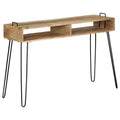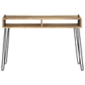 The wooden console table will make a timeless addition to your living room decor. Constructed from solid mango wood and sturdy steel frames, the table is highly stable and durable. The top is ideal for placing various decorative items like vases and potted plants. The shelves provides extra storage space for keeping your small items neatly organised. The steel frames add to the table's sturdiness as well as to its industrial style. Every step of the construction process is carried out with the greatest care, be it polishing and lacquering. Assembly is easy. Important note: The colours and grains of the wood may vary from piece to piece, making each piece unique and slightly different from the next. The delivery is random, ensuring the exclusivity and individuality of your product.