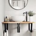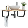 The wall mounted basin shelf securely attaches to the wall, providing an elegant and space-saving solution for your bathroom. Sturdy and long-lasting: This basin shelf is combined with a steel structure and a solid acacia wood top, making it sturdy, stable, and long-lasting.Space-saving: The floating basin shelf has ample space to store creams and small items. Thanks to the trapezium shape, you can hang towels or other things on the support to save space.Easy to use: The countertop comes undrilled to allow the basin to be mounted on the left, right, or in the centre, depending on your room's requirements. Thanks to the pre-drilled holes in the holder, it can be easily assembled with the tabletop and mounted on the wall.Wide applications: Thanks to its modern design, it provides additional space for various types of bathrooms. Good to know:Screws are not included, you can purchase the screws separately based on the information provided below.Wall attachment: 2 pcs M8 expansion screws per bracketWooden top: 2 pcs M5x18 screws (T=2) or 2 pcs M5x20 screws (T=2,5/4cm) per bracket