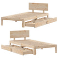 Get a better restful night's sleep from this bed frame! It makes a welcoming addition to any bedroom. Stable and long-lasting frame: Solid pinewood is known for its strength and durability. Its straight grains and distinctive knots contribute to its rustic charm.Slatted base for optimal support: The bed frame is equipped with a slatted base for support and breathability for your mattress.Extra storage space: This bed base features two drawers underneath, providing storage for items like extra bedding, seasonal clothing, and toys.Versatile headboard: This bedstead comes with a headboard that provides excellent back support when you sit up in bed to read or watch TV, while also serving as a decorative element.Effortless manoeuvrability: This under-bed storage drawer features four wheels, providing smooth and effortless manoeuvrability for sliding in and out from beneath your bed. Good to know:A mattress is not included with this bed. We do offer a various selection of mattresses. You can check our shop for a matching mattress.