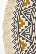 * The rug's round shape and bold design make it a perfect centerpiece for living rooms, bedrooms, or home offices, and its neutral color palette allows it to blend seamlessly with various decor styles.