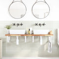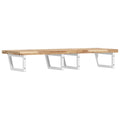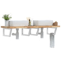 The wall mounted basin shelf securely attaches to the wall, providing an elegant and space-saving solution for your bathroom. Sturdy and long-lasting: This basin shelf is combined with a steel structure and a solid acacia wood top, making it sturdy, stable, and long-lasting.Space-saving: The floating basin shelf has ample space to store creams and small items. Thanks to the trapezium shape, you can hang towels or other things on the support to save space.Easy to use: The countertop comes undrilled to allow the basin to be mounted on the left, right, or in the centre, depending on your room's requirements. Thanks to the pre-drilled holes in the holder, it can be easily assembled with the tabletop and mounted on the wall.Wide applications: Thanks to its modern design, it provides additional space for various types of bathrooms. Good to know:Screws are not included, you can purchase the screws separately based on the information provided below.Wall attachment: 2 pcs M8 expansion screws per bracketWooden top: 2 pcs M5x18 screws (T=2) or 2 pcs M5x20 screws (T=2,5/4cm) per bracket