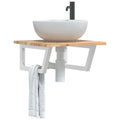 The wall mounted basin shelf securely attaches to the wall, providing an elegant and space-saving solution for your bathroom. Sturdy and long-lasting: This basin shelf is combined with a steel structure and a solid acacia wood top, making it sturdy, stable, and long-lasting.Space-saving: The floating basin shelf has ample space to store creams and small items. Thanks to the trapezium shape, you can hang towels or other things on the support to save space.Easy to use: The countertop comes undrilled to allow the basin to be mounted on the left, right, or in the centre, depending on your room's requirements. Thanks to the pre-drilled holes in the holder, it can be easily assembled with the tabletop and mounted on the wall.Wide applications: Thanks to its modern design, it provides additional space for various types of bathrooms. Good to know:Screws are not included, you can purchase the screws separately based on the information provided below.Wall attachment: 2 pcs M8 expansion screws per bracketWooden top: 2 pcs M5x18 screws (T=2) or 2 pcs M5x20 screws (T=2,5/4cm) per bracket