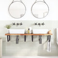 The wall mounted basin shelf securely attaches to the wall, providing an elegant and space-saving solution for your bathroom. Sturdy and long-lasting: This basin shelf is combined with a steel structure and a solid acacia wood top, making it sturdy, stable, and long-lasting.Space-saving: The floating basin shelf has ample space to store creams and small items. Thanks to the trapezium shape, you can hang towels or other things on the support to save space.Easy to use: The countertop comes undrilled to allow the basin to be mounted on the left, right, or in the centre, depending on your room's requirements. Thanks to the pre-drilled holes in the holder, it can be easily assembled with the tabletop and mounted on the wall.Wide applications: Thanks to its modern design, it provides additional space for various types of bathrooms. Good to know:Screws are not included, you can purchase the screws separately based on the information provided below.Wall attachment: 2 pcs M8 expansion screws per bracketWooden top: 2 pcs M5x18 screws (T=2) or 2 pcs M5x20 screws (T=2,5/4cm) per bracket