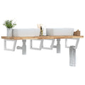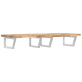 The wall mounted basin shelf securely attaches to the wall, providing an elegant and space-saving solution for your bathroom. Sturdy and long-lasting: This basin shelf is combined with a steel structure and a solid acacia wood top, making it sturdy, stable, and long-lasting.Space-saving: The floating basin shelf has ample space to store creams and small items. Thanks to the trapezium shape, you can hang towels or other things on the support to save space.Easy to use: The countertop comes undrilled to allow the basin to be mounted on the left, right, or in the centre, depending on your room's requirements. Thanks to the pre-drilled holes in the holder, it can be easily assembled with the tabletop and mounted on the wall.Wide applications: Thanks to its modern design, it provides additional space for various types of bathrooms. Good to know:Screws are not included, you can purchase the screws separately based on the information provided below.Wall attachment: 2 pcs M8 expansion screws per bracketWooden top: 2 pcs M5x18 screws (T=2) or 2 pcs M5x20 screws (T=2,5/4cm) per bracket