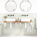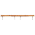 The wall mounted basin shelf securely attaches to the wall, providing an elegant and space-saving solution for your bathroom. Sturdy and long-lasting: This basin shelf is combined with a steel structure and a solid acacia wood top, making it sturdy, stable, and long-lasting.Space-saving: The floating basin shelf has ample space to store creams and small items. Thanks to the rectangular shape, you can hang towels or other things on the support to save space.Easy to use: The countertop comes undrilled to allow the basin to be mounted on the left, right, or in the centre, depending on your room's requirements. Thanks to the pre-drilled holes in the holder, it can be easily assembled with the tabletop and mounted on the wall.Wide applications: Thanks to its modern design, it provides additional space for various types of bathrooms. Good to know:Screws are not included, you can purchase the screws separately based on the information provided below.Wall attachment: 2 pcs M8 expansion screws per bracketWooden top: 2 pcs M5x18 screws (T=2) or 2 pcs M5x20 screws (T=2,5/4cm) per bracket