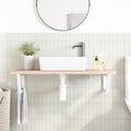 The wall mounted basin shelf securely attaches to the wall, providing an elegant and space-saving solution for your bathroom. Sturdy and long-lasting: This basin shelf is combined with a steel structure and a solid beech wood top, making it sturdy, stable, and long-lasting. Space-saving: The floating basin shelf has ample space to store creams and small items. Thanks to the trapezium shape, you can hang towels or other things on the support to save space. Easy to use: The countertop comes undrilled to allow the basin to be mounted on the left, right, or in the centre, depending on your room's requirements. Thanks to the pre-drilled holes in the holder, it can be easily assembled with the tabletop and mounted on the wall. Wide applications: Thanks to its modern design, it provides additional space for various types of bathrooms. Good to know:Screws are not included, you can purchase the screws separately based on the information provided below. Wall attachment: 2 pcs M8 expansion screws per bracket Wooden top: 2 pcs M5x18 screws (T=2) or 2 pcs M5x20 screws (T=2,5/4cm) per bracket