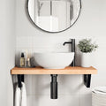 The wall mounted basin shelf securely attaches to the wall, providing an elegant and space-saving solution for your bathroom. Sturdy and long-lasting: This basin shelf is combined with a steel structure and a solid beech wood top, making it sturdy, stable, and long-lasting. Space-saving: The floating basin shelf has ample space to store creams and small items. Thanks to the trapezium shape, you can hang towels or other things on the support to save space. Easy to use: The countertop comes undrilled to allow the basin to be mounted on the left, right, or in the centre, depending on your room's requirements. Thanks to the pre-drilled holes in the holder, it can be easily assembled with the tabletop and mounted on the wall. Wide applications: Thanks to its modern design, it provides additional space for various types of bathrooms. Good to know:Screws are not included, you can purchase the screws separately based on the information provided below. Wall attachment: 2 pcs M8 expansion screws per bracket Wooden top: 2 pcs M5x18 screws (T=2) or 2 pcs M5x20 screws (T=2,5/4cm) per bracket