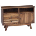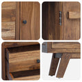 The Solid Teak Wood Sideboard effortlessly combines vintage charm with modern functionality. This beautifully handcrafted piece fits seamlessly in both dining and living rooms, offering a touch of elegance and practicality. Its brown hue and textured surface capture the eye, making it an ideal focal point in your home. The sideboard stands at 100 x 30 x 68 cm, providing ample space not only for organizing but also enhancing your room's aesthetic. Elegant Materials: Crafted from Solid Teak Wood, this sideboard showcases a rich, look with a smooth, fine sanded finish. These materials promise reliability and stand the test of time, accentuating any interior with a timeless vintage appeal. Comprehensive Storage Features: Equipped with solid wood doors, drawers, and shelves, the sideboard optimizes organization. Whether it's dinnerware in the dining room or family albums in the living room, its ample storage space caters to varied needs and preferences. Classic Design Elements: Vintage design, featuring solid wood legs and handmade details, sets a nostalgic tone while ensuring robust support. Easy to complement with other furniture pieces, its style suits both rustic and contemporary home themes. Adaptable Usage: Perfect for living or dining areas, it holds keys, decorative items, and even electronic accessories. Its versatility makes it a key piece for any home, blending in with various settings and purposes. Maintenance &Care: This sideboard is easy to care for. Simply avoid abrasive cleaners to preserve its stunning finish. Regular dusting ensures its longevity and maintains its eye-catching grain pattern.