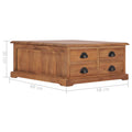 This colonial-style wooden coffee table, made of solid teak, will add a touch of rustic charm to your interior. It can also be used as a side table or end table. The coffee table has a sturdy hardwood table top, on which you can place decorative items like fruit baskets or vases. The 4 drawers provide ample space for keeping all kinds of smaller items organised and within reach. Important note: Colours and grains may vary from piece to piece, making each of our coffee table unique. The delivery is random, ensuring the exclusivity and individuality of your product.