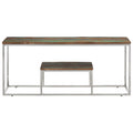 Combining functionality and beauty, this coffee table will be the focal point of your room. Solid reclaimed wood top: Solid reclaimed wood consists of reused timbers such as teak, mango wood, pinewood, and beech. These materials are recycled from old buildings such as factories, sheds, and boats. As every piece is handmade, colours will vary for each product. The top of the side table provides a secure and ample surface to place snacks, drinks, vases, fruit bowls, or other decorative items.Sturdy and stable frame: The stainless steel frame of the living room table ensures sturdiness and stability.Easy maintenance: This accent table with stain-resistant surface is easy to wipe clean and you can effortlessly keep the table looking its best.Simple design: This sofa table has a simple and modern design that complements any room decor. Good to know:Colours and grains vary per furniture item, making each piece unique. The delivery is random, ensuring the exclusivity and individuality of your product.