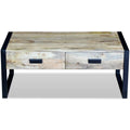 This antique-style wooden coffee table, with a spectacular vintage style, will make it a decorative as well as practical addition to your decor. Whether you are looking for a coffee table on which you can place food and drinks, or a side table for a lamp, vase or other decorative items, this table with its sturdy top will be a great choice. This coffee table has two drawers to provide you with extra storage space for keeping small items like keys, notepads, pens, and other knick-knacks. Its iron box legs add to its sturdiness and stunning industrial style. The visible grain structure makes every piece of furniture unique and slightly different from the next. The coffee table is fully handmade, and the craftsmanship adds to its spectacular retro style. Every step of the process is carried out with the greatest care, be it polishing, painting or waxing. Important note: Colours vary from piece to piece, making each of our console tables unique. The delivery is random, ensuring the exclusivity and individuality of your product.