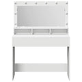 This Dressing Table with LED Lights is a refined piece of modern furniture designed to bring sophistication and functionality to your bedroom setup. With its sleek rectangular shape and clean lines, it merges traditional aesthetics with contemporary style. The surface is a visual delight, featuring textured engineered wood that enhances the decor while providing a practical solution for storage and organization. The plane mirror incorporated into its design adds a touch of elegance, making it perfect for grooming and decoration. Equipped with ample storage spaces, this dressing table is tailored for individuals who appreciate organized and convenient living spaces, ensuring everything you need is beautifully and efficiently stored. Quality Engineered Wood: The primary material is engineered wood, known for its remarkable durability and strength. This textured surface provides a semi-gloss finish, adding a trendy visual appeal to the dressing table. Its ability to withstand wear and tear enhances longevity and reduces maintenance efforts. Ample Storage Options: Equipped with multiple drawers and board shelves, this piece offers extensive storage solutions to keep your essentials neatly organized. The shelves are crafted from high-grade engineered wood, ensuring stability and resilience for a wide range of items. Plane Mirror Integration: A central plane mirror adds elegance and functionality, providing an accurate and distortion-free reflection. Ideal for makeup application, personal grooming, and adding a spacious feel to any room. Easy Maintenance: Designed with your convenience in mind, this table is easy to maintain, requiring only a damp cloth for cleaning. This simple care routine ensures a polished, fresh look daily, enhancing longevity. LED Lighting Feature: Not just visually striking but also practical, these LED lights offer efficient and bright illumination, perfect for detailed tasks like makeup application and daily grooming.