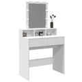 The dressing table is a great addition to your bedroom decor while keeping your cosmetics close at hand! Stable and durable material: Engineered wood is a durable and stable material with a smooth surface that is resistant to moisture, warping, and splitting, making it a reliable choice for a variety of projects.Ample storage space: The makeup table with 2 drawers and 3 compartments offers ample storage space for keeping your various daily essentials well organised and within easy reach.Utility mirror: A beautiful mirror provides the view for makeup application and adds an elegant touch to the vanity desk.LED light: The vanity table has LED bulbs with USB, which are easy to switch modes from warm to cold white. The featured LED bulbs around the mirror illuminate your beauty as well. Warning:To prevent it from tipping over, this product must be used with the provided wall attachment device.