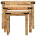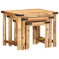These three nesting side tables are a smart solution for small living spaces or any area with limited room. With an industrial design, this side table set adds a chic touch to your living room, bedroom, or office. Robust and stable material: Solid mango wood, a robust tropical hardwood, is highly favoured for furniture making for its exceptional durability and strength. Its beautiful wood grains make every piece of furniture slightly different from the next.Nesting design: This set includes tables of different sizes to meet your various needs. The smaller table neatly tucks away inside the larger one to save space when required. Also, you can arrange them separately to maximise the available tabletop space.Versatile function: Any one of these nesting tables can be used as a nightstand in the bedroom, a side table, or a couch table in the living room and office.Sturdy top: The sturdy tabletop of the nesting stand is ideal for placing your drinks or any other necessities you need close at hand. Good to know:Each item is unique with variations in colours and grains. The delivery is random, ensuring the exclusivity and individuality of your product.