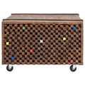 This industrial-style side table will make a unique addition to your decor. It can also be used as a coffee table, an end table, etc. This durable and beautiful table is made of teak hardwood to look like a stack of beams held together by a pair of black belts. The side table is ideal for placing drinks, vases, potted plants, fruit baskets, and other decorative items. The natural finish makes the table easy to clean. Thanks to its four wheels, this rustic table is very easy to move around. Good to know:Colours and grains vary per furniture item, making each piece unique. The delivery is random.