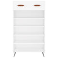 Keep your shoes organised and create a tidy environment with this elegant shoe cabinet! Durable material: The engineered wood is of exceptional quality with smooth surface and also features strength, stability and resistance to moisture.Ample storage space: This shoe cupboard has 1 drawer and 5 open compartments, providing ample storage space for all types of shoes.Stable cabinet top: The top of this shoe stand is suitable for placing your favourite decorative items such as vases, potted plants, etc.Practical design: The iron feet add an industrial style to your interior while ensuring stability. The faux leather drawer handles which are soft and delicate protect you and your family from accidental knocks and bumps. Warning:To prevent it being overturned, this product must be used with the provided wall attachment device.
